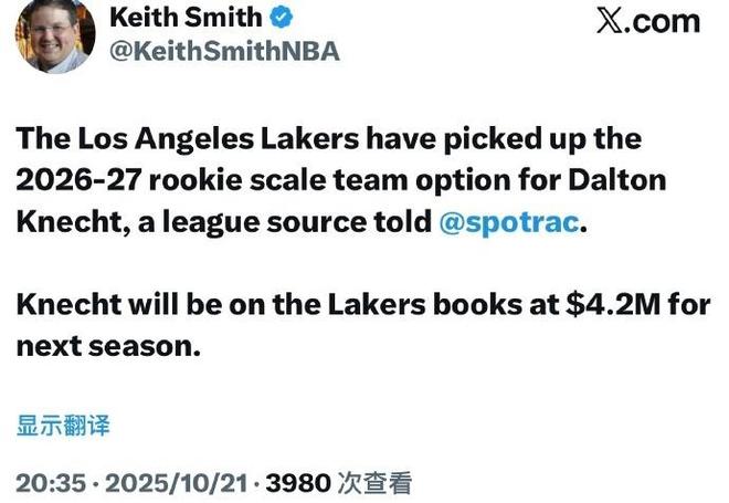 北京时间10月21日,根据NBA记者Keith Smith报道,湖人已经执行24岁年轻球员克内克特的2026-27赛季价值420万美元的球队选项。只是克内克特自从上赛季交易告吹后,他重返湖人就状态持续下滑,在此前的季前赛表现被外界批评为“负资产”,湖人想要交易存在困难。